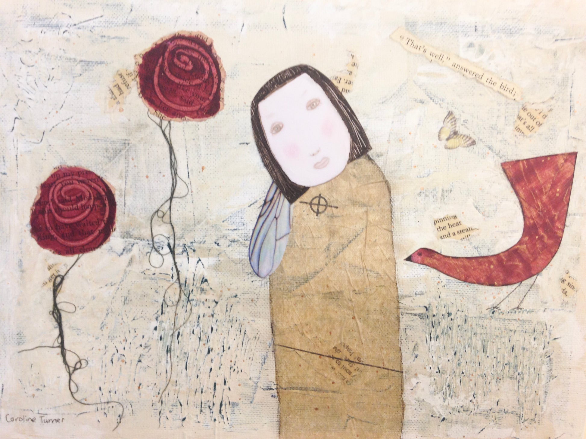 In this moment, boundaries dissolve. The figure and the bird share a language beyond speech, a communion of spirit and curiosity. The textures and layers in the artwork echo the layers of meaning in their exchange, some things spoken, others simply felt.